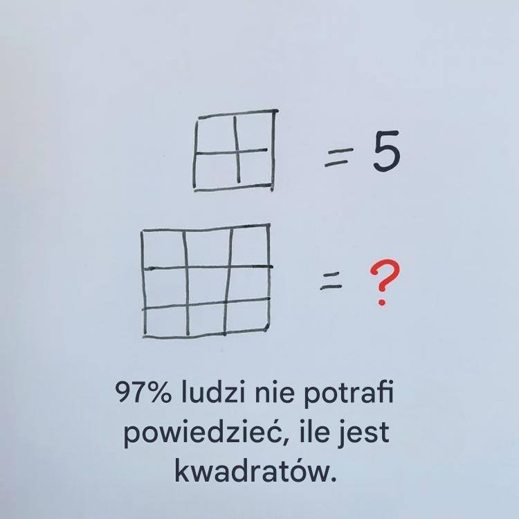 De meest voor de hand liggende: vierkanten ter grootte van een enkel nest. In een 3×3 raster zijn er 9 (één per vakje). Naast de 2×2 vierkanten zijn er kleinere vierkanten. Hoeveel passen er in? Stel je voor dat je een 2×2 vierkant in het raster sleept: het kan beginnen in de linkerbovenhoek, middenboven, links van het midden, enz. Er zijn er in totaal 4. Voeg ten slotte een enorm vierkant toe dat het hele raster beslaat: 1. Dus we krijgen 9 + 4 + 1 = 14. Klaar! Niet de andere vergrootglazen, gewoon een kleine variant.