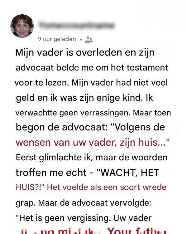 Ik verwachtte geen verrassingen. Maar toen begon de advocaat: "Volgens de wensen van uw vader, zijn huis..."