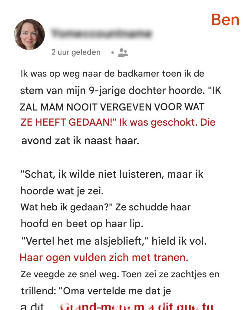 « Ik zal mama nooit vergeven wat ze heeft gedaan! » hoorde Isabella haar dochter Hailey in de telefoon fluisteren. De woorden kwamen als een koude schok. Wat had ze gedaan? Wat voor vreselijks geloofde Hailey? Angst sloeg haar om het hart toen ze besefte dat iemand het hoofd van haar dochter vol leugens had gestopt. En die leugens konden alles kapotmaken.