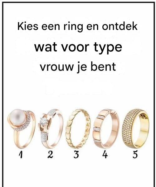 Bekijk de vijf ringen in de afbeelding hierboven en kies de ring die je direct aanspreekt. Aarzel niet, kies de ring die het beste bij je past. Lees na je keuze de onderstaande beschrijving om te ontdekken wat je keuze zegt over het type vrouw dat je bent.