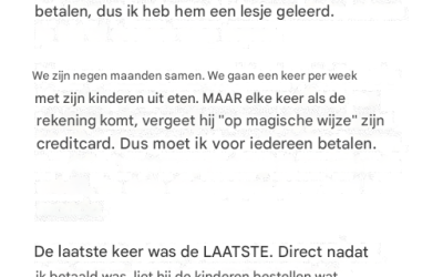 Mijn partner vergeet altijd zijn portemonnee als we uit eten gaan.